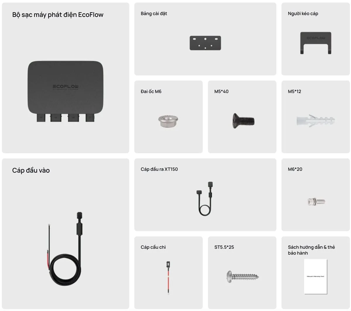 *Bộ sạc máy phát điện 800W đi kèm cáp XT150 để ghép nối với các sản phẩm dòng DELTA của EcoFlow. Cần mua thêm cáp XT60 để có khả năng tương thích rộng hơn.