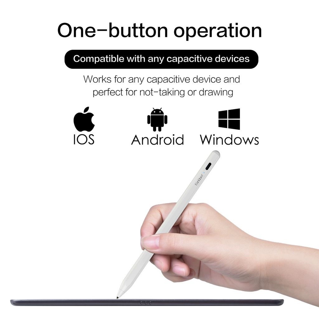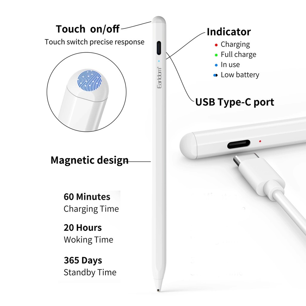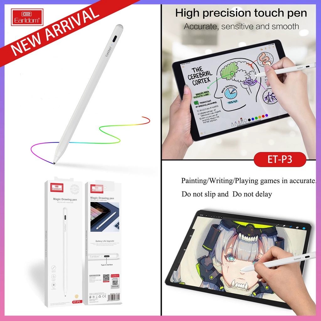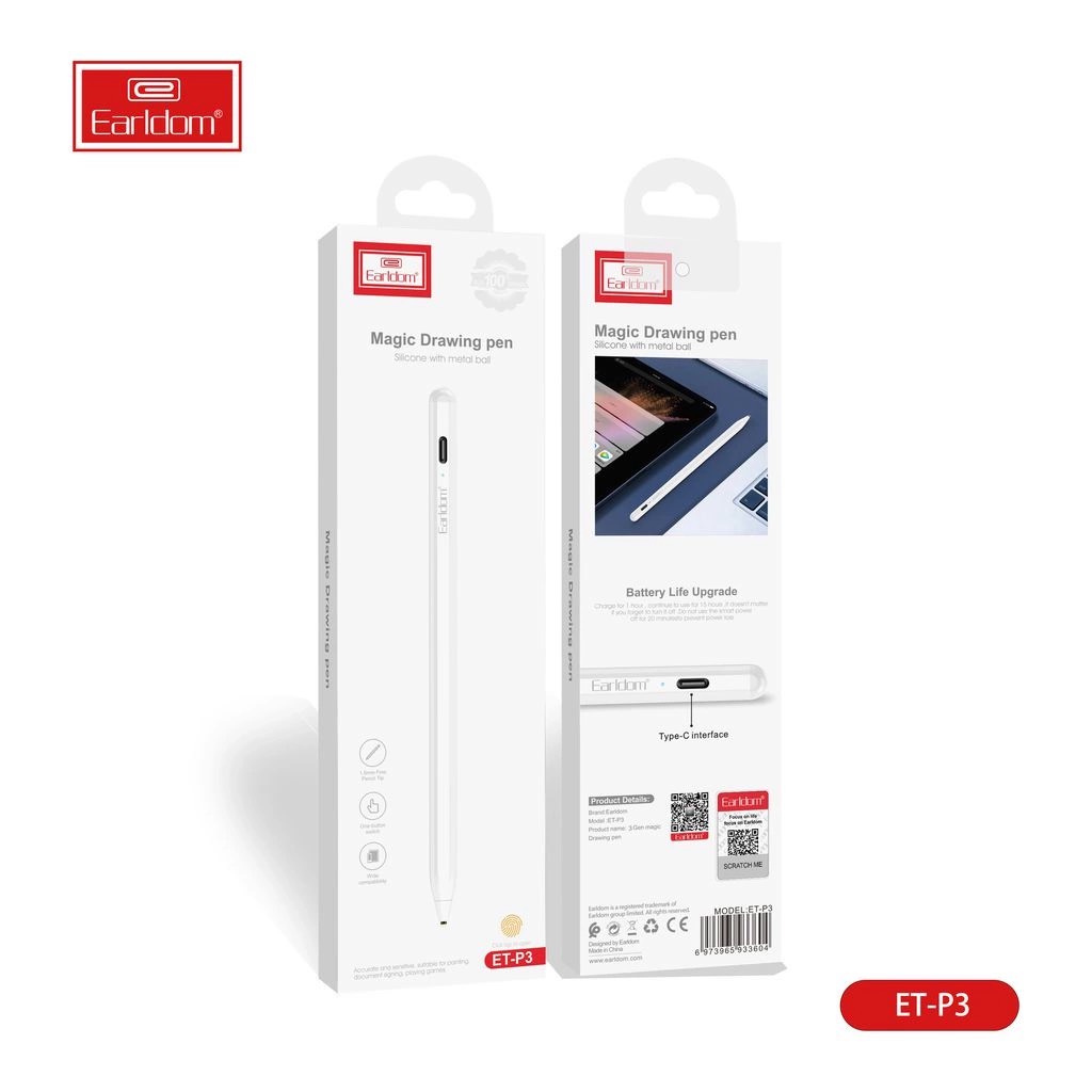 Hãng Sản Xuất: Earldom Model: ET-P3 + Công nghệ cảm ứng: Điện dung + Màu sặc: Trắng + Chất Liệu: Hợp kim nhôm + Cổng Sạc: Type C - Đây là dòng sản phẩm dùng để thao tác trên màn hình cảm ứng. Khi sử dụng, thiết bị này sẽ mang lại độ chính xác cao hơn so với thao tác đầu ngón tay bởi có những chi tiết rất nhỏ - Được thiết kế tinh tế và sang trọng với kích thước chỉ bằng 1 chiếc bút bi thông thường cho phép bạn dễ dàng bỏ vào trong túi sách và balo mang đến bất cứ nơi đâu - Sử dụng chất liệu kim loại nguyên khối và được sơn tĩnh điện cao cấp mang lại cảm giác cầm nắm được chắc chắn hơn và có độ đầm tay nhất định - Sản phẩm này sử dụng công nghệ cảm ứng điện dung tương thích với toàn bộ các loại màn hình từ điện thoại thông minh, Taplet đến màn hình cảm ứng của laptop giúp bạn dễ dàng sử dụng - Ngòi bút NPC cao cấp nâng tốc độ phản hồi cảm ứng gấp 1.5 lần - Thân bút có nam châm từ tính, với chất liệu aluminium phủ ceramic cao cấp giúp độ bền và khả năng chịu lực tốt nhất - Cảm biến bật tắt, tiết kiệm điện năng tự động ngắt sau 5 phút sử dụng - Viên Pin lớn cho phép bạn sử dụng lên tới 20h và sạc lại nhanh chóng chỉ trong 1 giờ hoạt động