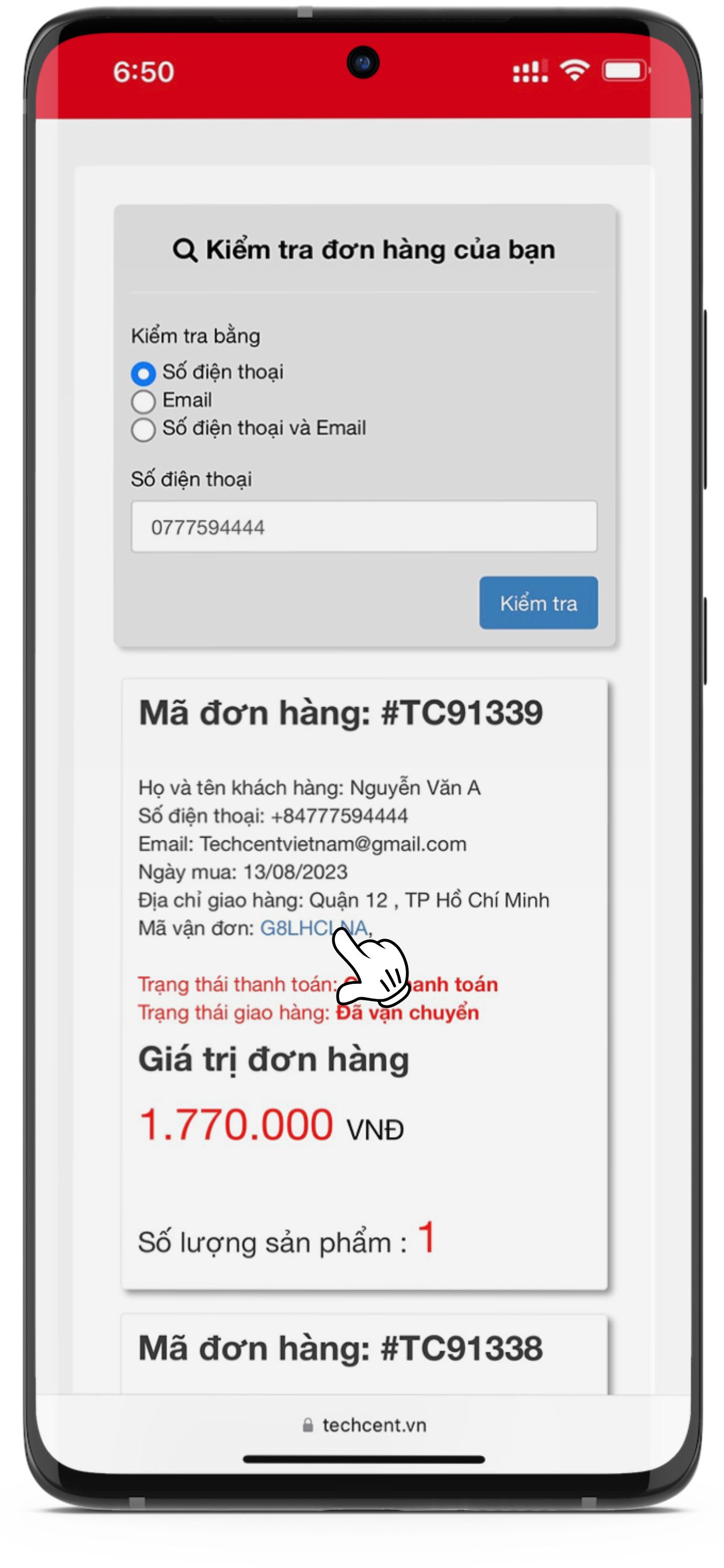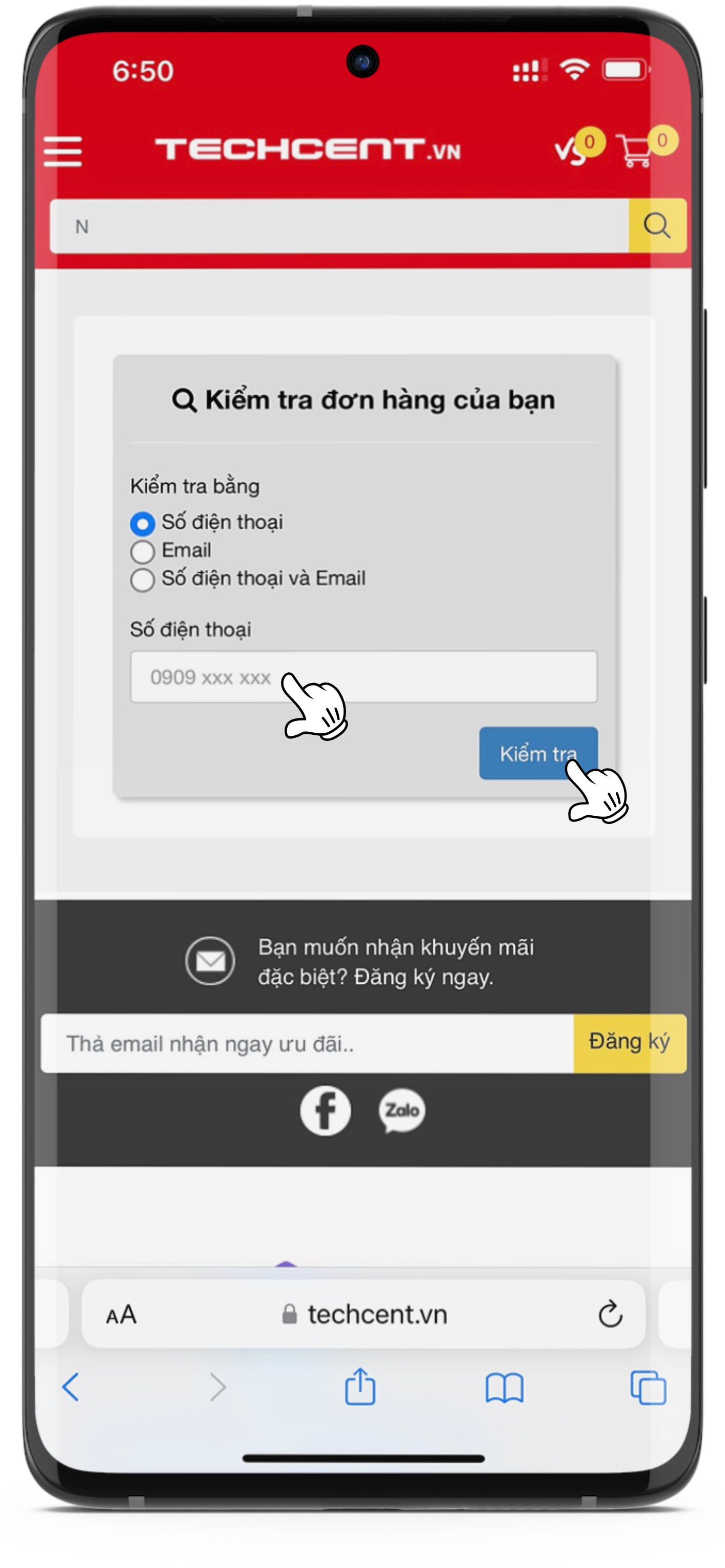 Bước 3: Điền Số điện thoại mua hàng và ấn "Kiểm Tra"