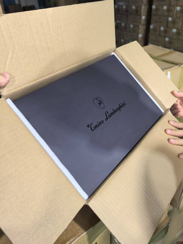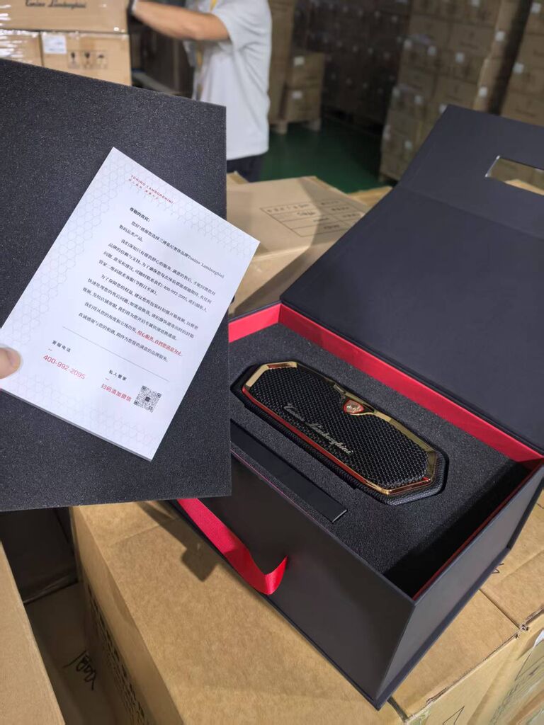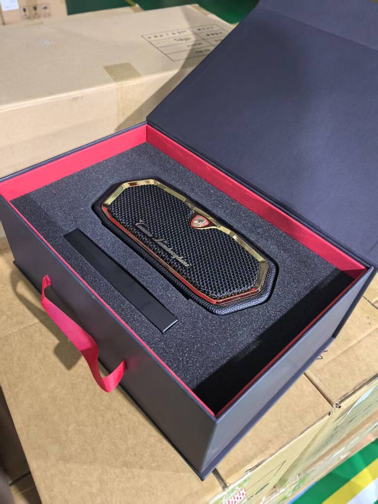 Có logo mạ vàng 18K và da nappa chống va đập, phản chiếu nội thất xe hơi sang trọng.