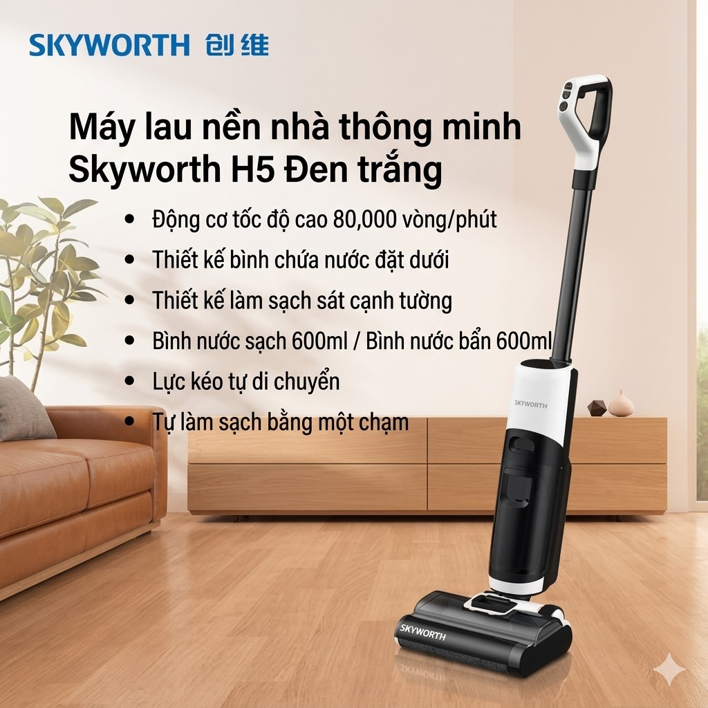 Máy hút bụi & lau nhà cầm tay thông minh Skyworth H5 là sản phẩm đáng cân nhắc trong phân khúc thiết bị gia dụng hiện đại. Với thiết kế nhỏ gọn, khả năng làm sạch 2 trong 1 và tính linh hoạt cao, sản phẩm giúp bạn tiết kiệm đáng kể thời gian và công sức trong việc dọn dẹp hàng ngày.