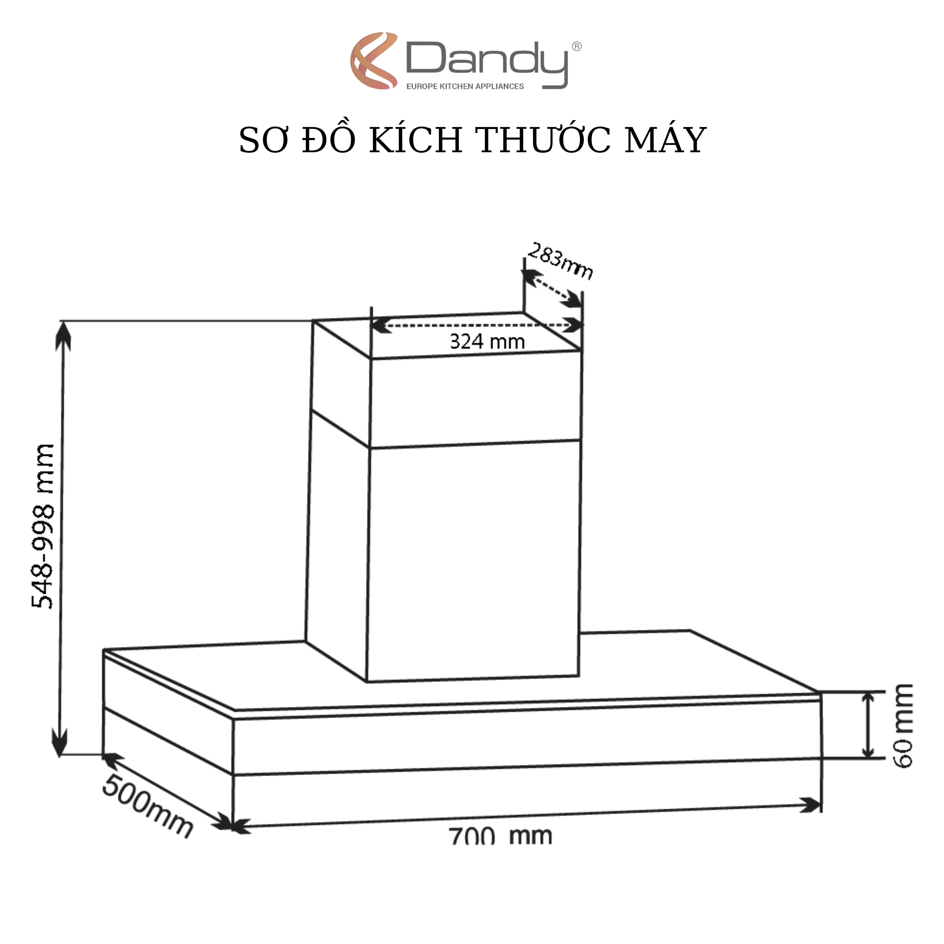 Kích thước của máy hút mùi Dandy DY-HT416 là R700 x S500 x C550 mm.