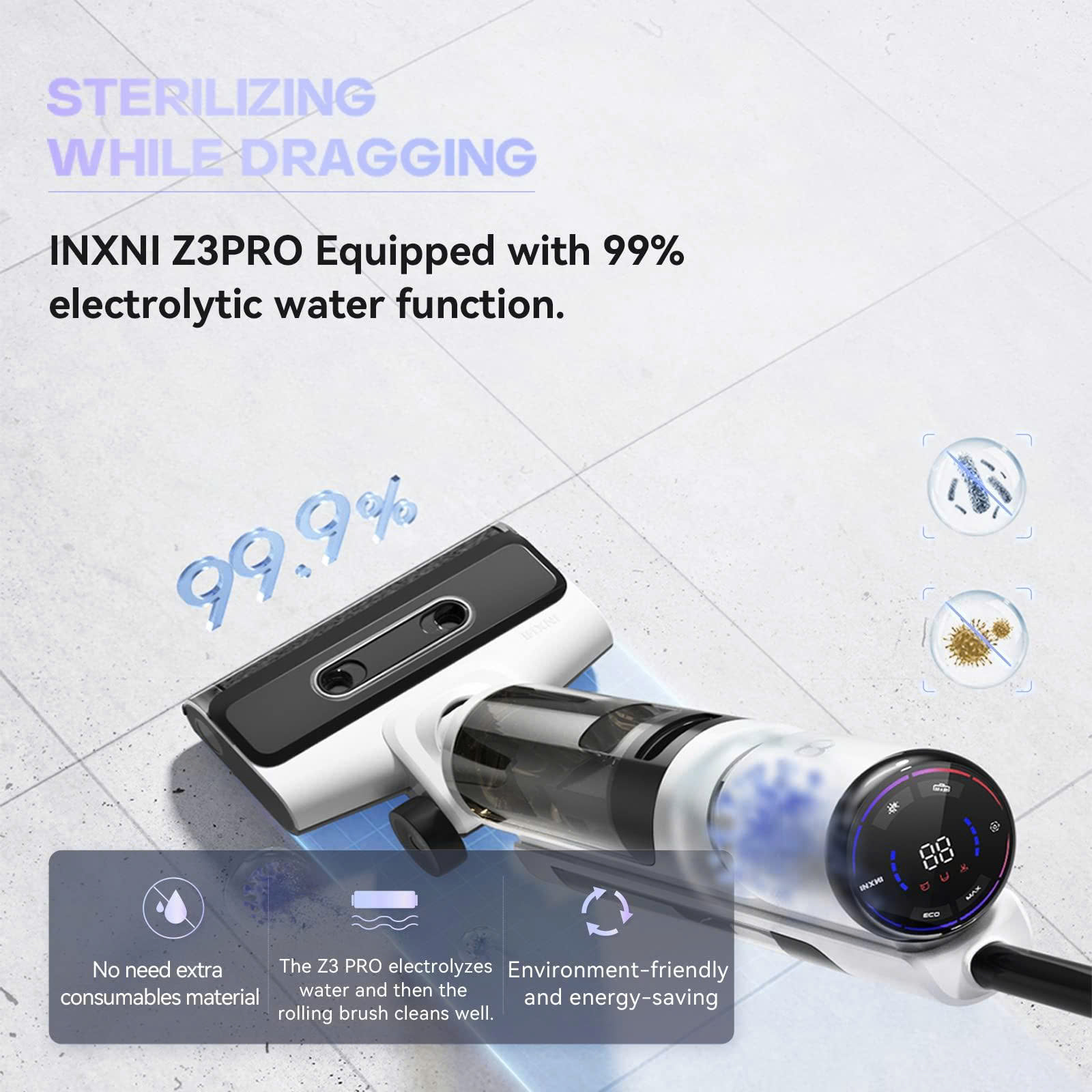 Meta Description: Khám phá Máy lau hút bụi INXNI Z3 Pro 3 trong 1: hút 16.000Pa, lau và rửa sàn đồng thời. Công nghệ nước điện phân diệt 99.9% vi khuẩn, tự làm sạch con lăn, sấy khô bằng lực ly tâm. Nhẹ 4kg, chống nước IP67. Trợ thủ dọn dẹp hiện đại cho mọi gia đình.