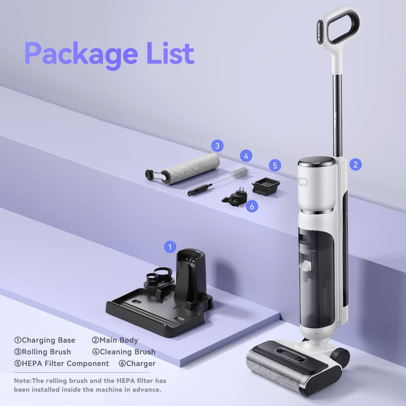 Đế sạc, dây nguồn, chổi vệ sinh, bộ lọc HEPA (tuỳ nơi bán) |