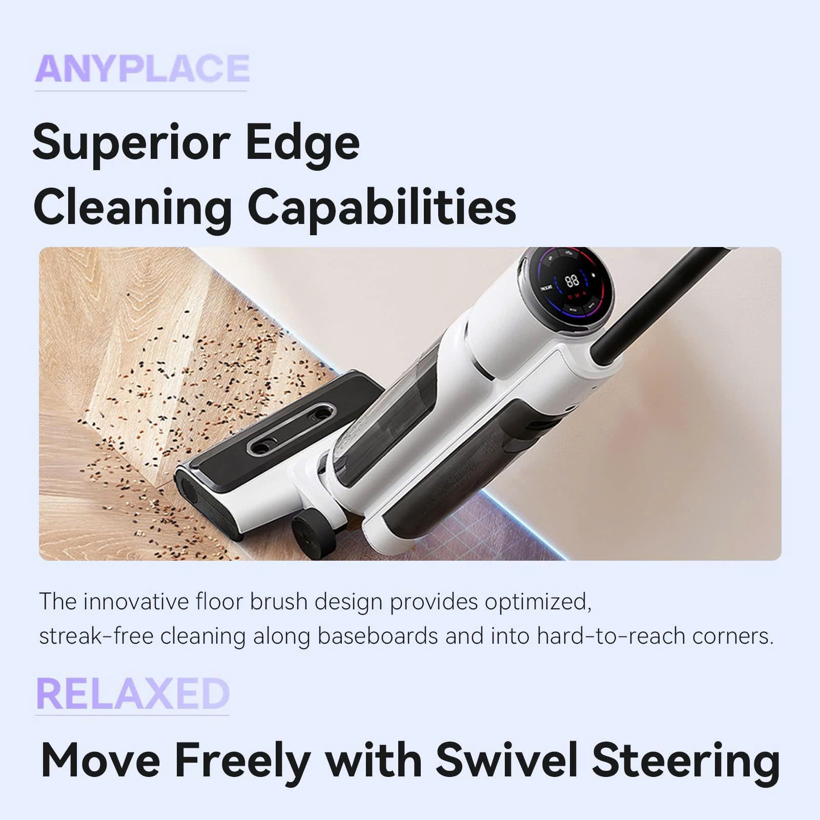 Làm sạch sát cạnh tường & góc hẹp: Thiết kế con lăn và chổi được tối ưu hóa, cho phép máy làm sạch sát cạnh tường và các góc hẹp, đảm bảo không bỏ sót bất kỳ khu vực nào trong nhà.