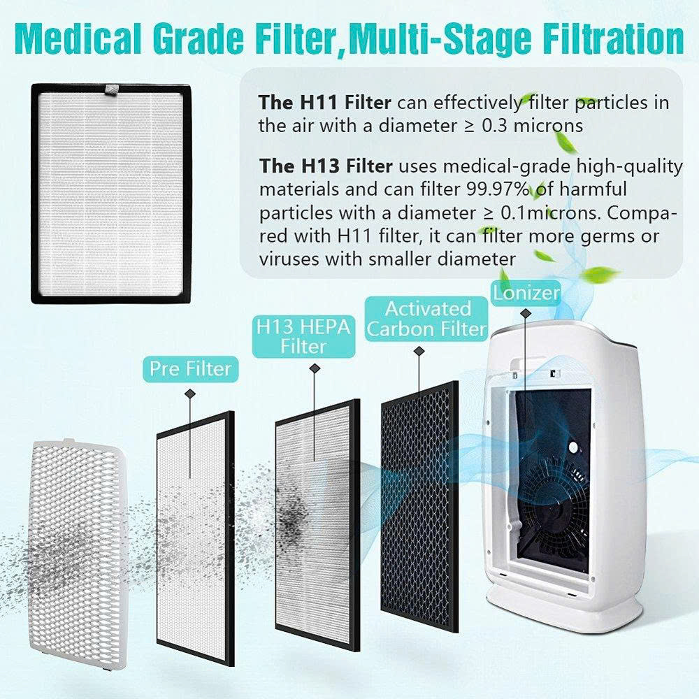 Hiệu suất lọc siêu mịn: Máy sử dụng công nghệ lọc HEPA H13, là chuẩn lọc cao cấp thường được dùng trong môi trường y tế. Màng lọc này có khả năng loại bỏ đến 99.97% các hạt siêu mịn có kích thước 0.3 micron trở lên.