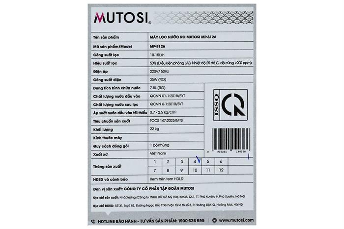 Máy lọc nước RO Mutosi MP-S126 10 lõi đạt chuẩn quốc gia QCVN 6-1:2010/BYT, đảm bảo nước uống trực tiếp an toàn.
