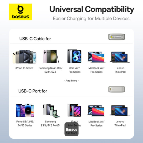 Pin Dự Phòng Tích Hợp Cáp Sạc Dây Rút Gọn Baseus Free2Pull có khả năng sạc đa năng với đầu ra USB-C và USB-A, cho phép sạc đồng thời nhiều thiết bị. Sản phẩm tương thích với các thiết bị di động của nhiều hãng như iPhone, Samsung, Huawei, Xiaomi, và các thiết bị khác.