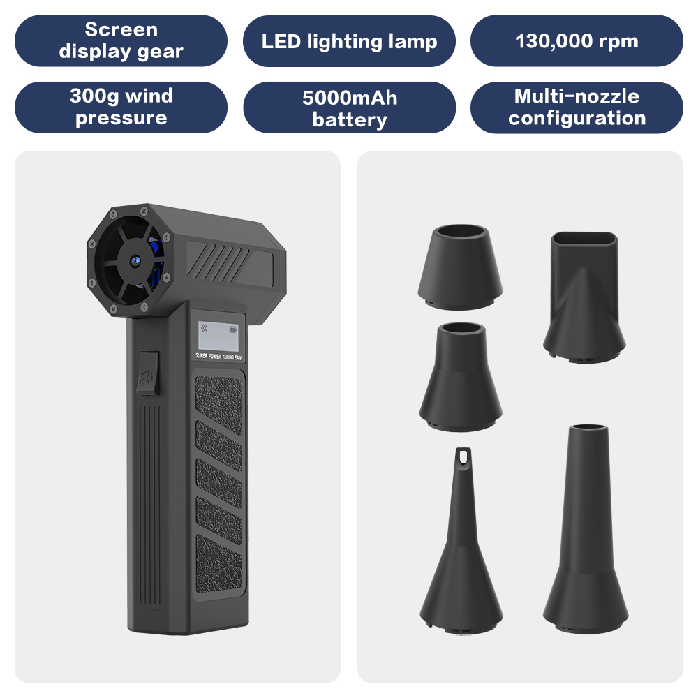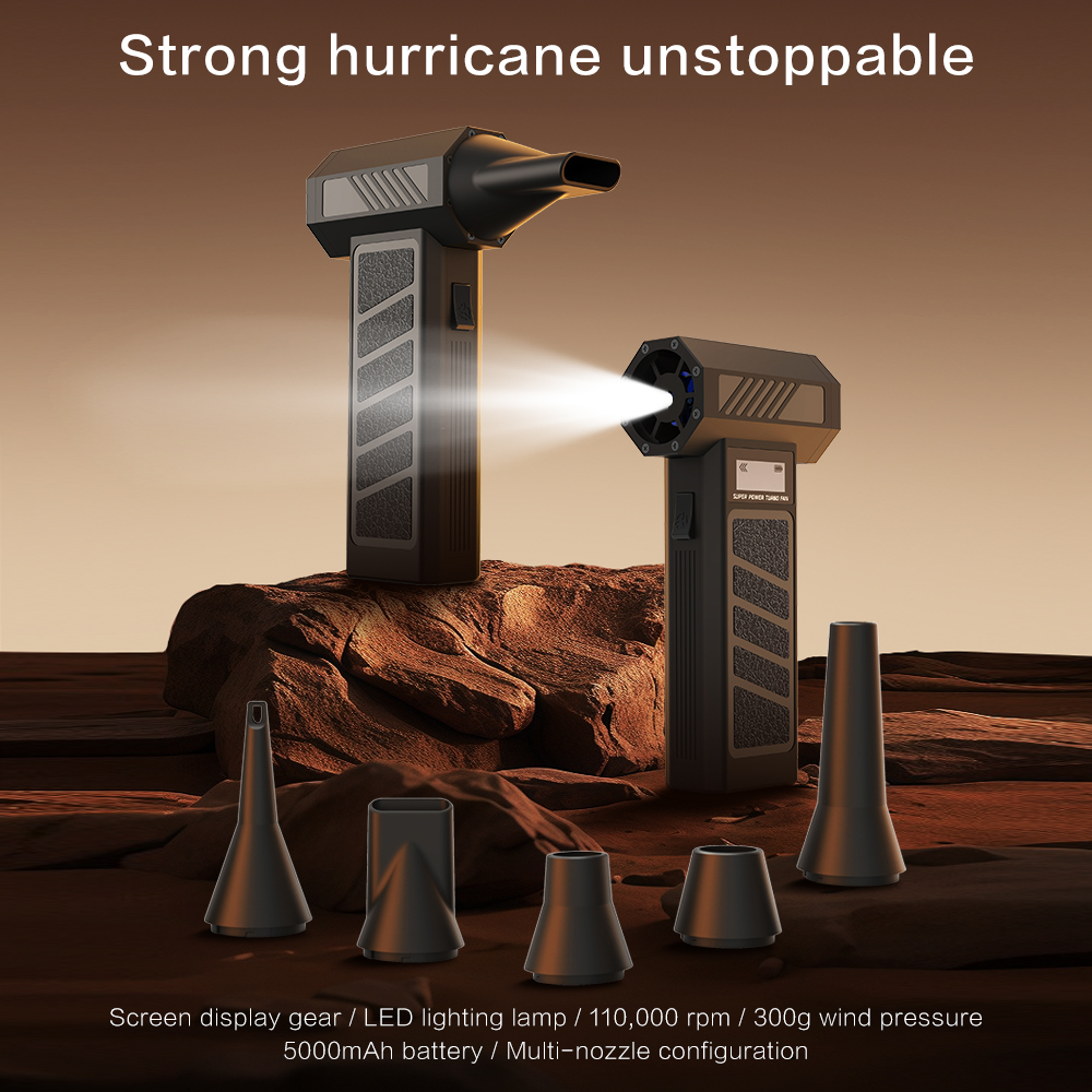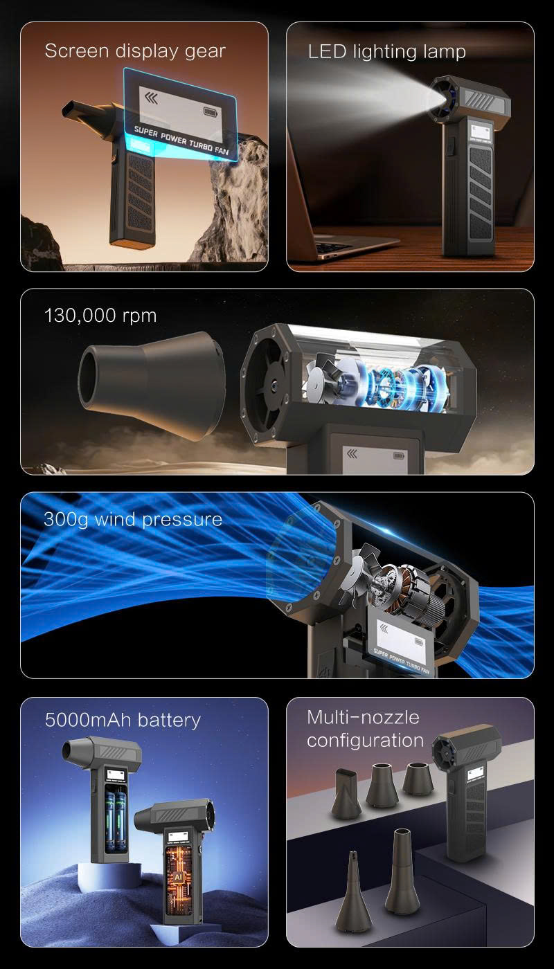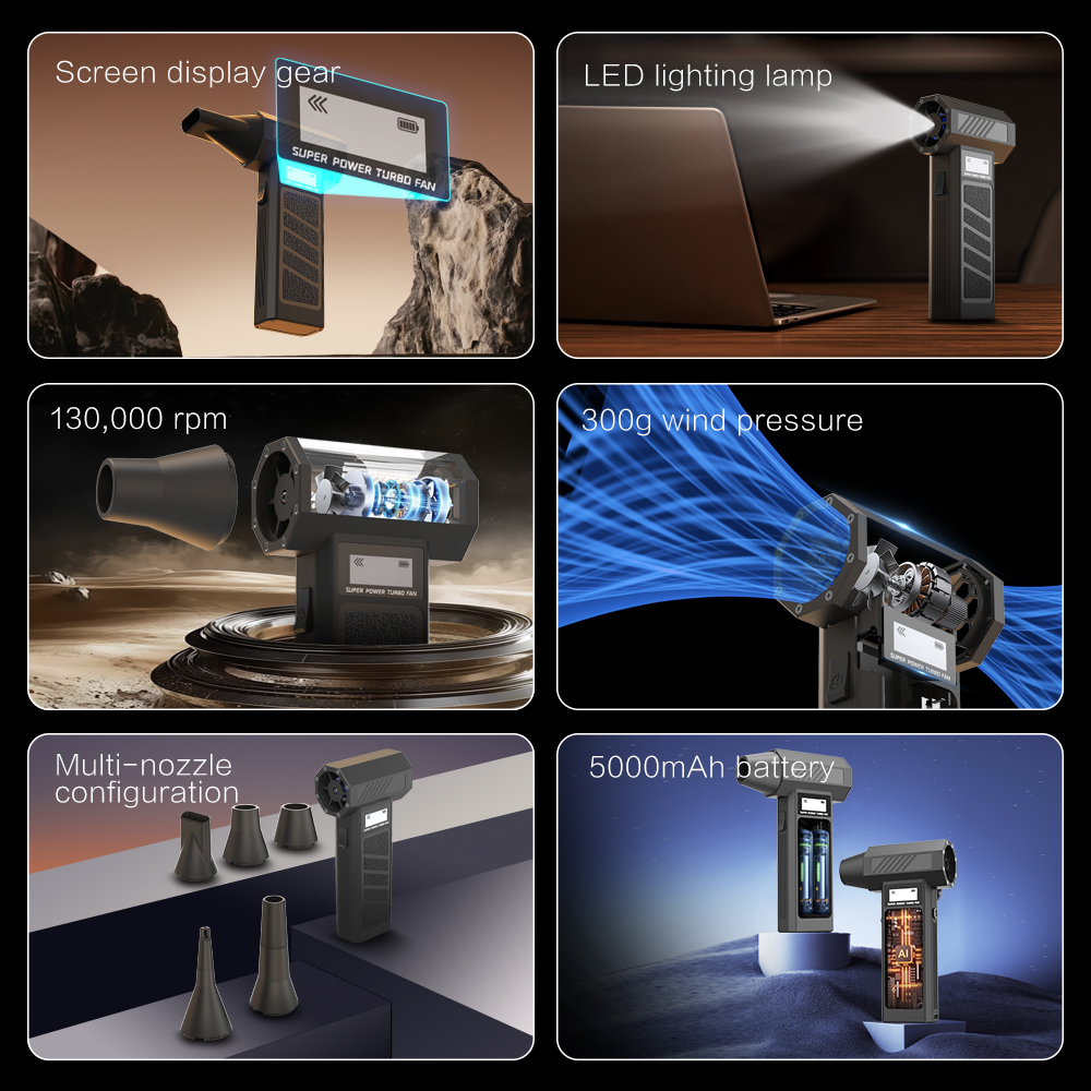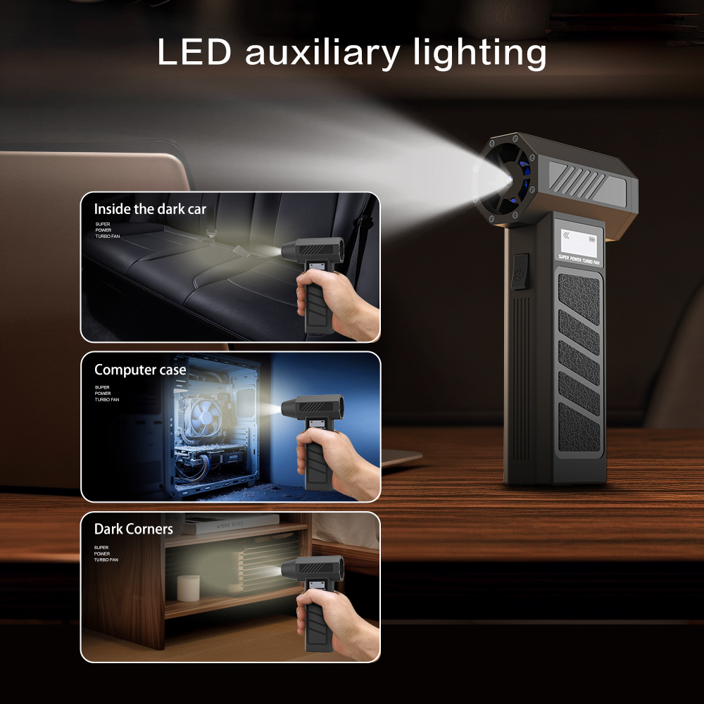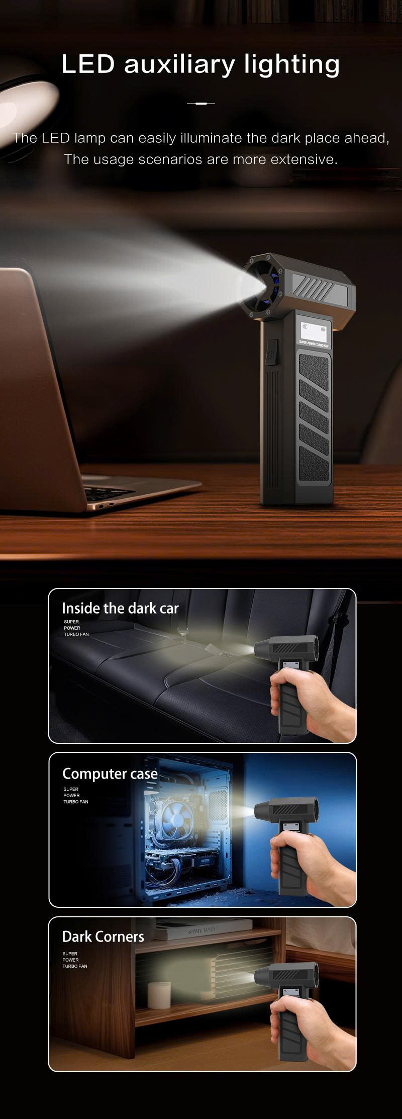 Tự hào có quạt turbo, quạt này có hiệu quả loại bỏ bụi bẩn ẩn trong các khe hở của bàn phím hoặc bất kỳ thiết bị điện tử nào, giúp quạt cực kỳ tiện dụng khi lau bụi ở nhà, văn phòng hoặc ô tô.