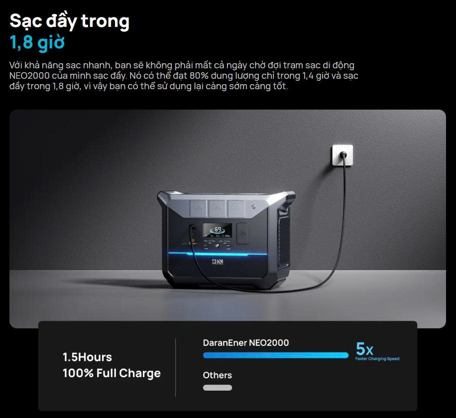 Với công nghệ biến tần hai chiều hàng đầu trong ngành của EnerTurbo, trạm phát điện di động NEO2000 có thể được sạc đầy 100% trong 1,8giờ chỉ bằng một dây cáp AC mà không làm giảm tuổi thọ pin.