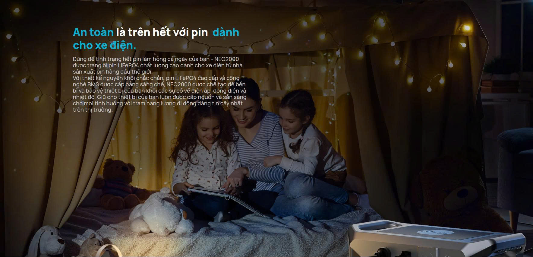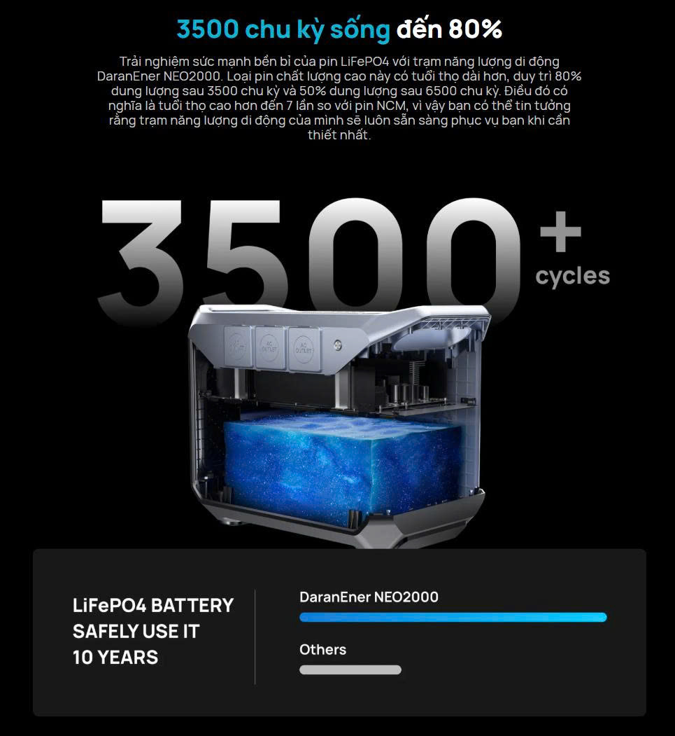 Với thiết kế nguyên khối chắc chắn, pin LFP an toàn nhất (LiFePO4) và công nghệ BMS độc quyền được cấp bằng sáng chế để bảo vệ quá áp, dòng điện và nhiệt độ, NEO2000 DaranEner được thiết kế để tạo ra nguồn điện di động có tuổi thọ lâu nhất.