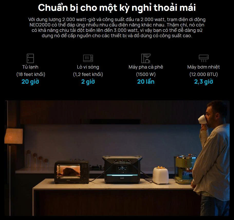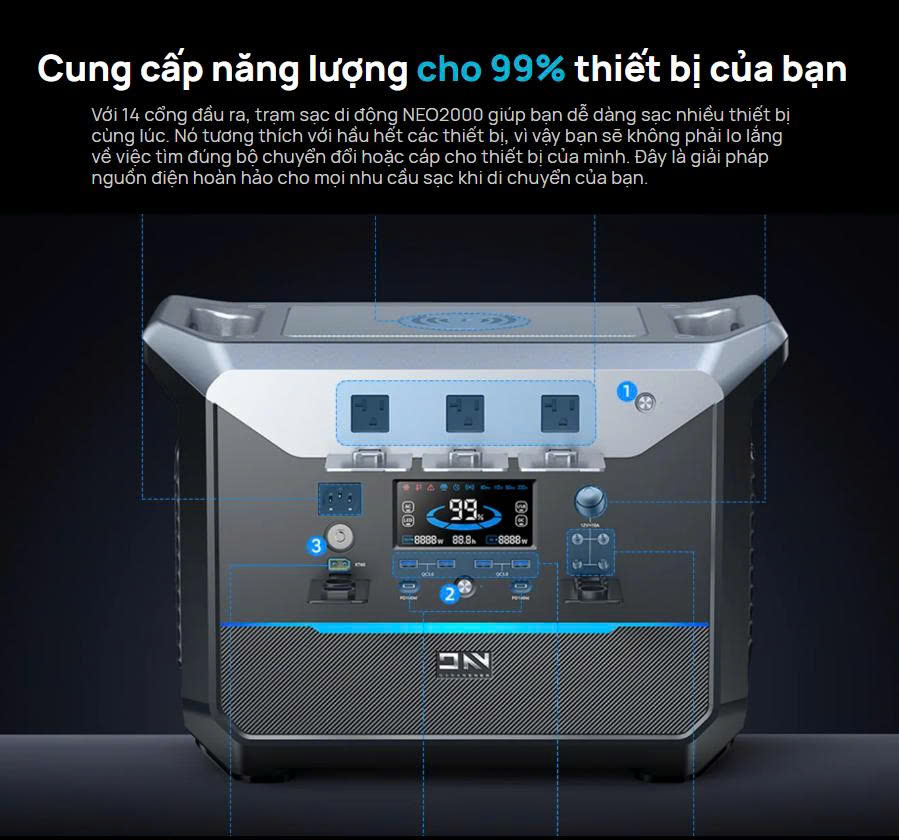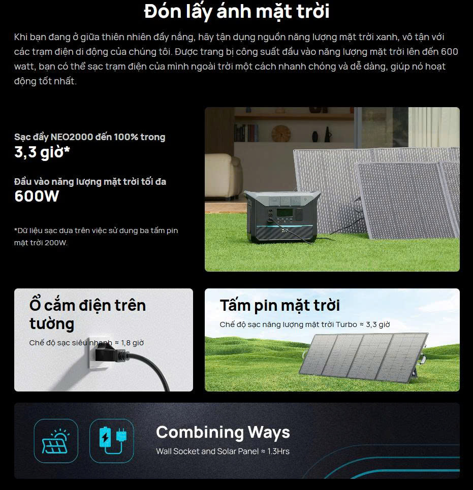 Máy phát điện năng lượng mặt trời xanh: Máy phát điện năng lượng mặt trời NEO2000 hỗ trợ sạc qua, 3 ổ cắm AC (2000W, công suất cực đại 3000W), 4 ổ cắm DC (12V), 4 cổng USB (QC3.0), 2 cổng Type-C (PD 100W), cổng đầu vào năng lượng mặt trời XT60 (33-60V/20A, tối đa 600W), 1 ổ cắm ô tô, sạc không dây 15W và 1 đèn LED. Đây là người bạn đồng hành lý tưởng cho các trường hợp khẩn cấp trong gia đình, công việc ngoài trời, cắm trại và cuộc sống trên xe RV.