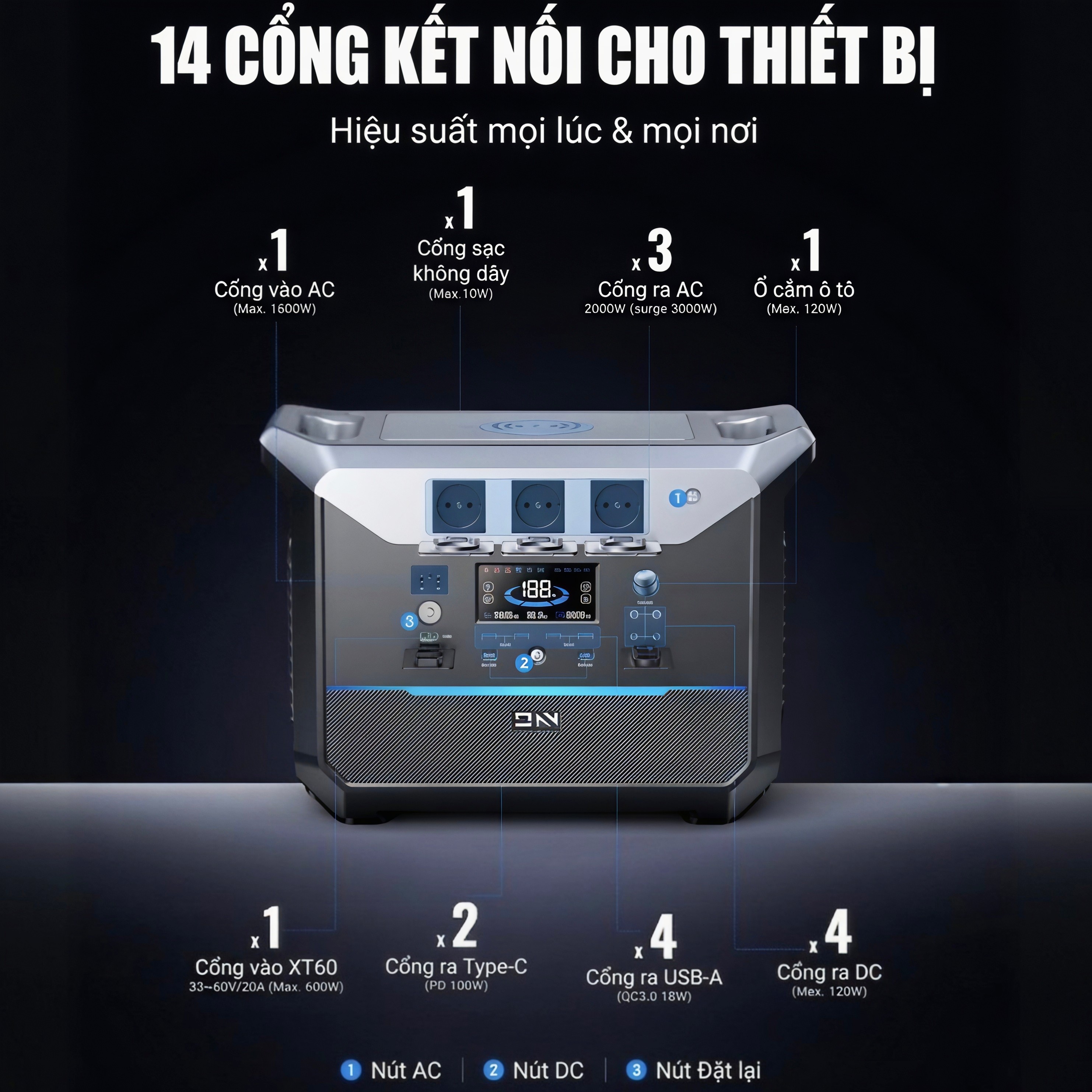 Công suất 2073,6Wh và công suất đầu ra AC 2000W: Trạm điện di động DaranEner NEO2000 có dung lượng pin 2073,6Wh và công suất đầu ra AC 2000W (Tối đa 3000W), có thể cấp điện cho hầu hết các thiết bị và đồ dùng điện của bạn.