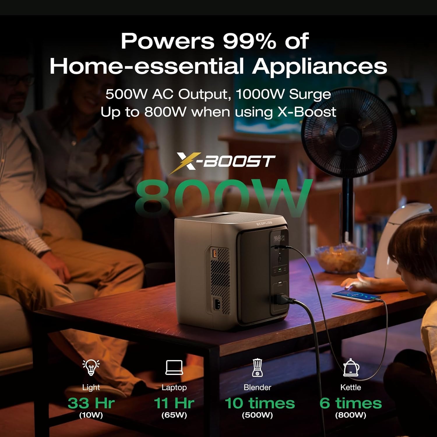 Công suất AC 500W (X-Boost 800W) – Vận hành 99% thiết bị gia dụng cơ bản như quạt, đèn, laptop, router, tủ lạnh mini,…