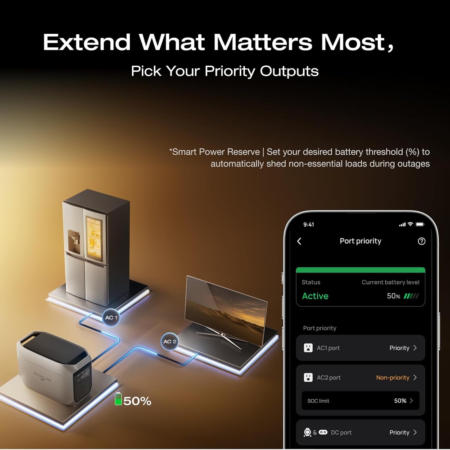 DELTA 3 Max / DELTA 3 Max Plus giới thiệu công nghệ Ưu tiên đầu ra thông minh (Smart Output Priority Tech). Tính năng mới tiện lợi này cho phép bạn lựa ưu tiên cung cấp nguồn cho các thiết bị qua ứng dụng. Ưu tiên những thiết bị quan trọng như tủ lạnh, Wi-Fi hoặc thiết bị y tế… để kéo dài thời gian sử dụng khi cần thiết nhất, ngay cả khi bạn không có mặt ở nhà.