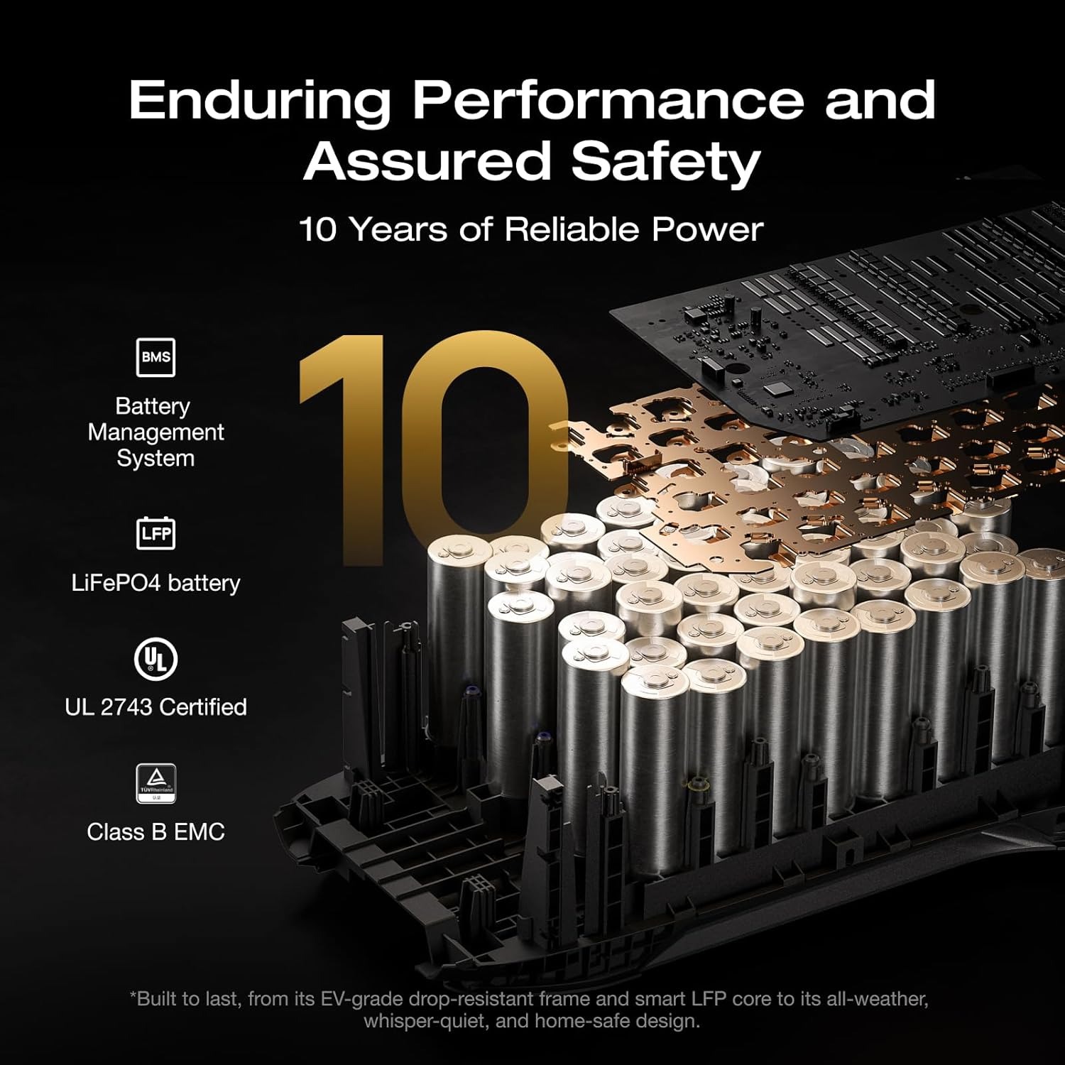~2048 Wh (2 kWh) pin LiFePO₄ bền & an toàn, tuổi thọ ~10 năm. |