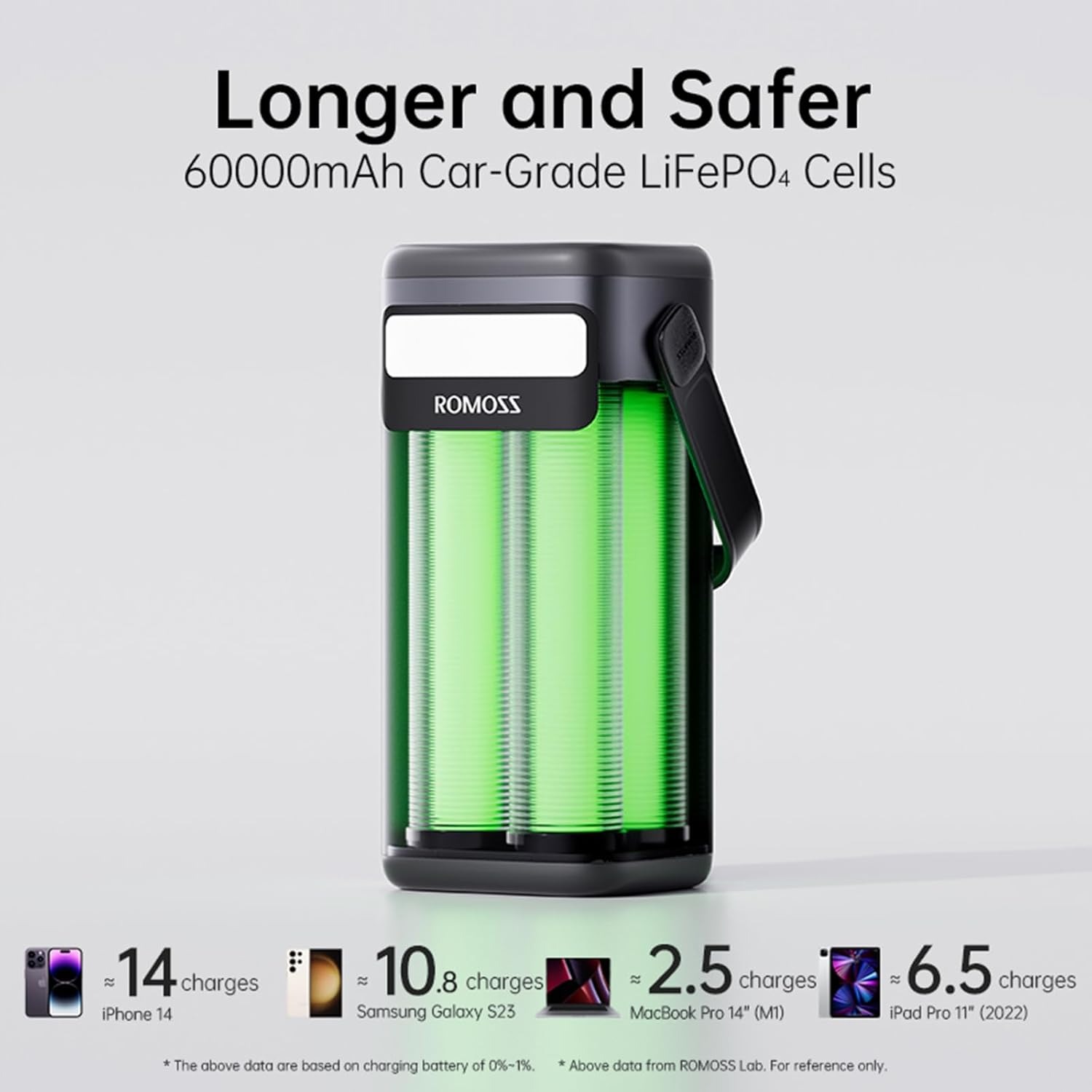 60.000mAh cho phép sạc điện thoại hơn 10 lần, laptop 2–3 lần, hoặc dùng làm nguồn cấp cho đèn, quạt mini, camera hành trình khi đi xa. -