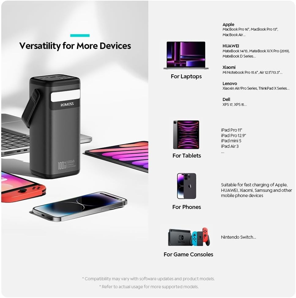 Romoss PMT60 là pin sạc dự phòng cao cấp với dung lượng cực khủng 60.000mAh và công suất sạc nhanh 100W hai chiều, đáp ứng nhu cầu cấp nguồn cho laptop, điện thoại, máy ảnh, đèn chiếu sáng hay các thiết bị điện tử ngoài trời.