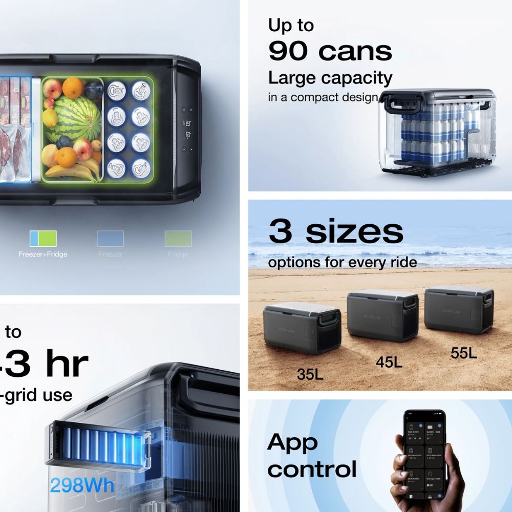 EcoFlow GLACIER Classic tối ưu hóa hiệu quả lưu trữ, chứa được 58 lon (35L), 72 lon (45L) và 90 lon (55L) nước ngọt 330ml mà vẫn gọn gàng và tiết kiệm không gian.